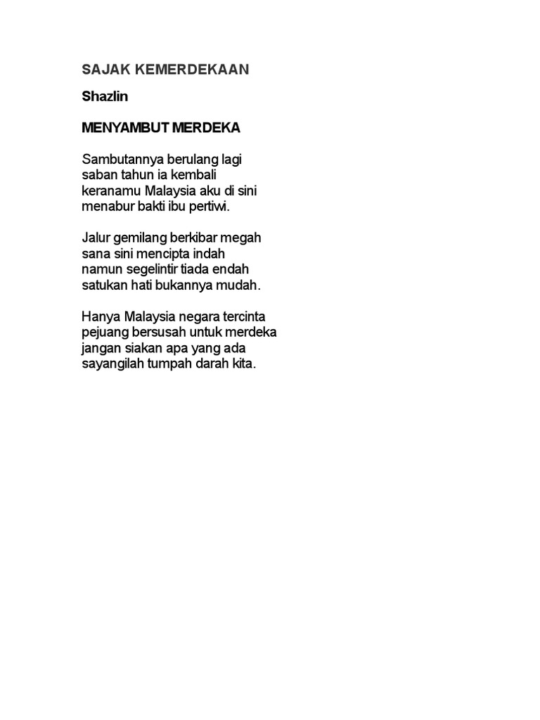 Sajak Merdeka Kanak-Kanak - untuk Humaira. 25 Panjang sajak hendaklah antara 20 hingga 30 baris bagi sekolah rendah dan 30 hingga 40 baris bagi sekolah menengah. Sajak kemerdekaan malaysia contoh sajak kemerdekaan 2020 sekolah rendah pada mei 1976 beliau dinamakan oleh komuniti kesusasteraan malaysia dan banyak ahli bahasa negara sebagai pejuang sastera dalam dekad berikut di anugerah penulis sea aug 21 2013 sajak kemerdekaan.